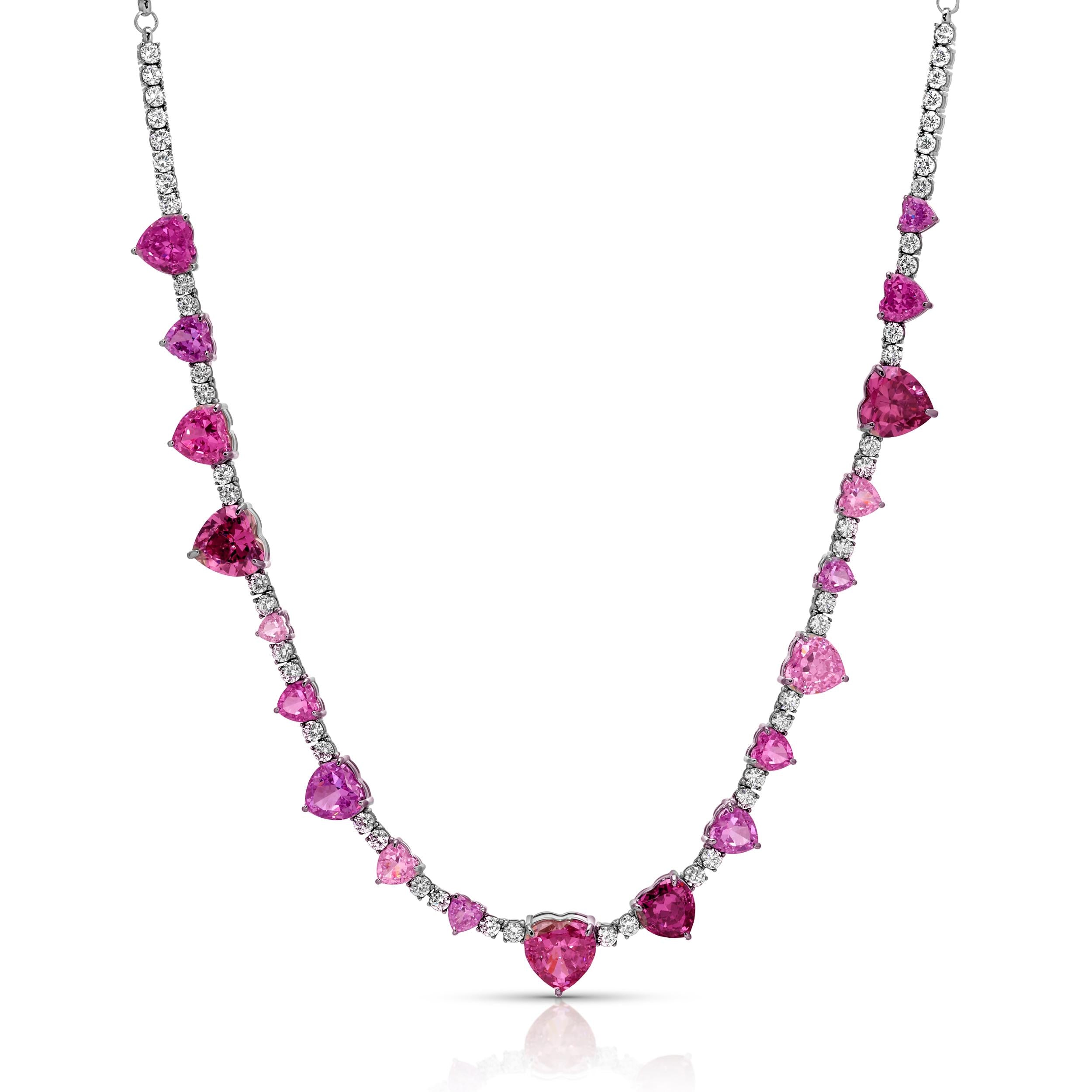 A limited edition heart shaped version of our signature daydream necklace, This necklace features lab-grown, hand-cut, custom colored lab stones in beautiful shades of pink and purple. Each gem is meticulously crafted for a unique, stunning piece. Limited quantities make it an exclusive choice for discerning buyers. The high-quality gems enhance the overall appeal of this necklace. Perfect for those who appreciate fine craftsmanship and exclusivity.