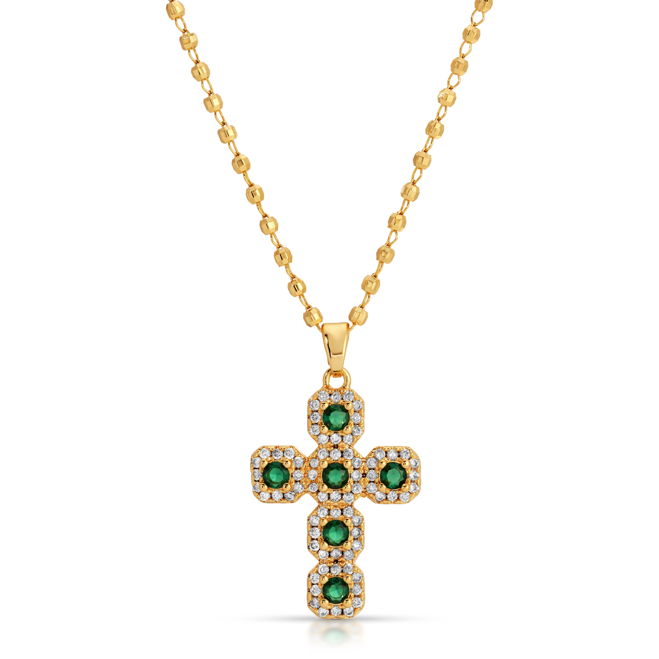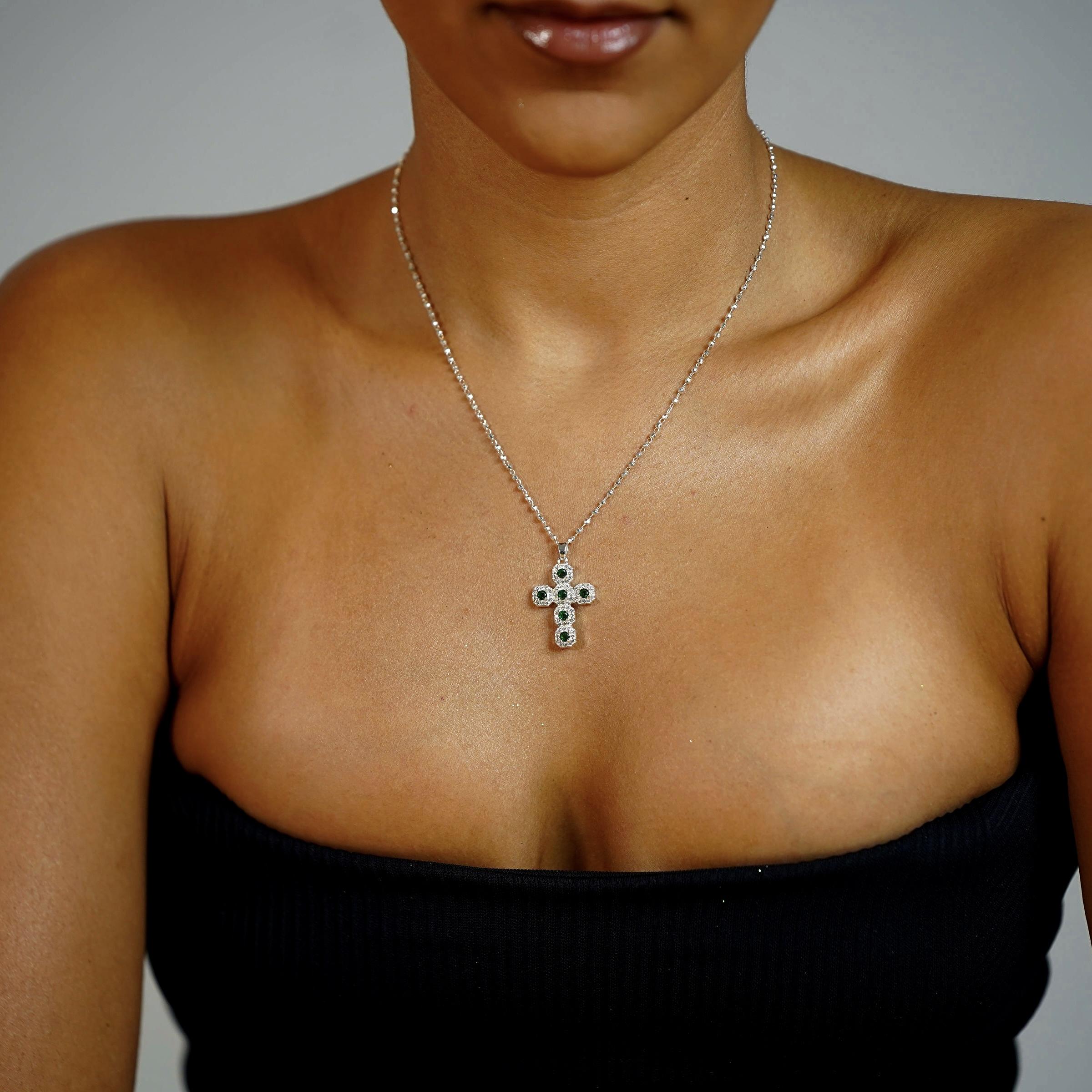 Our Emerald Icy Cross necklace showcases a stunning green CZ Cross pendant on a ball-style chain. This versatile piece is perfect for layering or wearing alone. The necklace is unisex and comes in 5 lengths. Please refer to the size chart for the best fit.