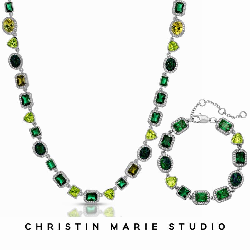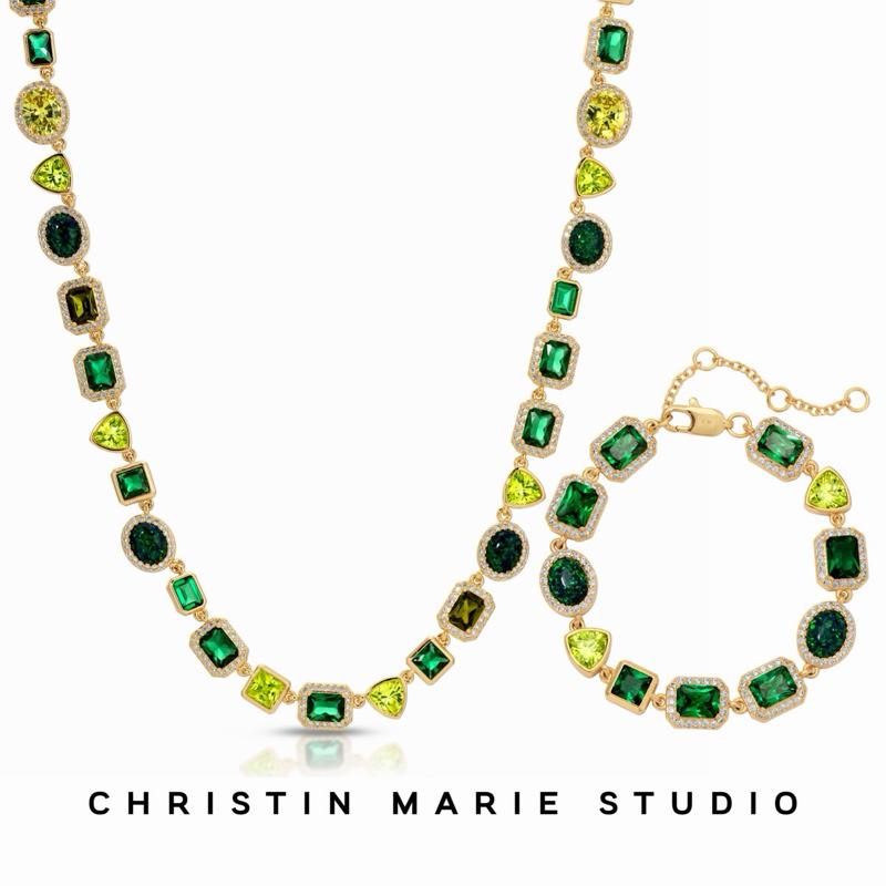 The newest addition to our Solstice Gemstone collection, these pieces epitomize luxury and sophistication. It features our new rounded triangle shape and green-toned gemstones and opals, meticulously placed to highlight their natural brilliance. Perfect for individual wear or layering, it's a great statement piece. The necklace and bracelet is unisex and adjustable by 2 additional inches. Matching anklet sold separately.