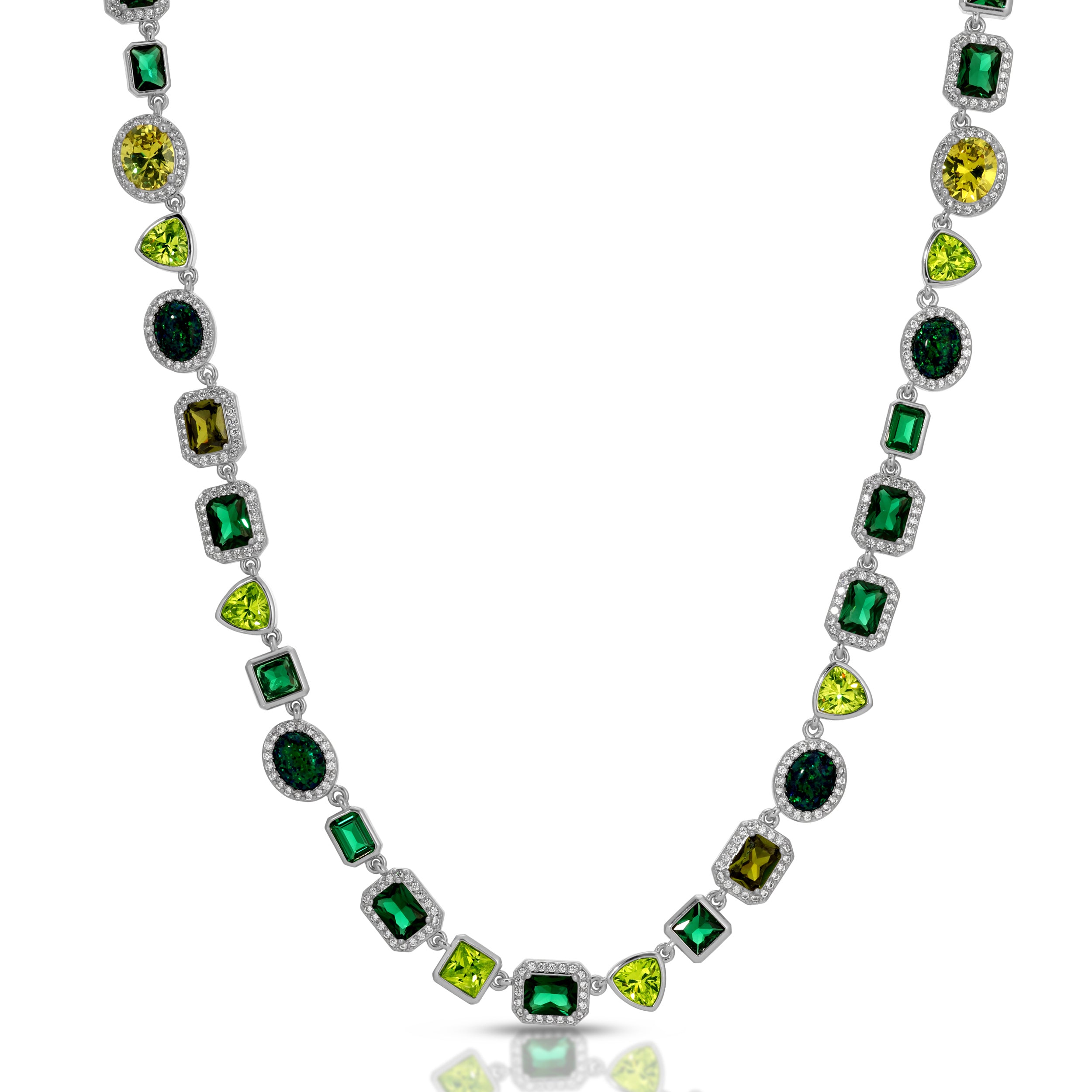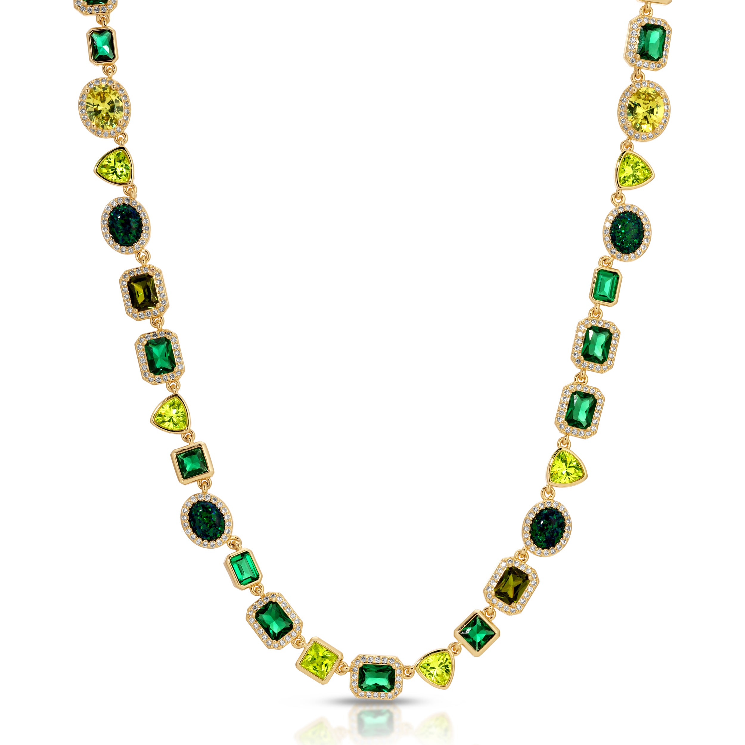 The newest addition to our Solstice Gemstone collection, this necklace epitomizes luxury and sophistication. It features our new rounded triangle shape and green-toned gemstones and opals, meticulously placed to highlight their natural brilliance. Perfect for individual wear or layering, it's a great statement piece. The necklace is unisex and adjustable by 2 additional inches. Matching bracelet and anklet sold separately.