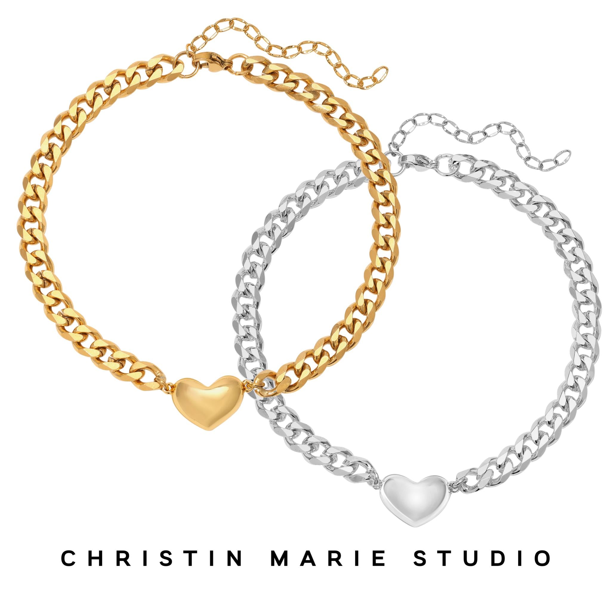 The Havana Heart Anklet features a small puff heart center attached to a beautifully cut Cuban Link chain. The anklet is available in 18k gold plating and bright silver plating over stainless steel. Matching necklace and bracelet sold separately.