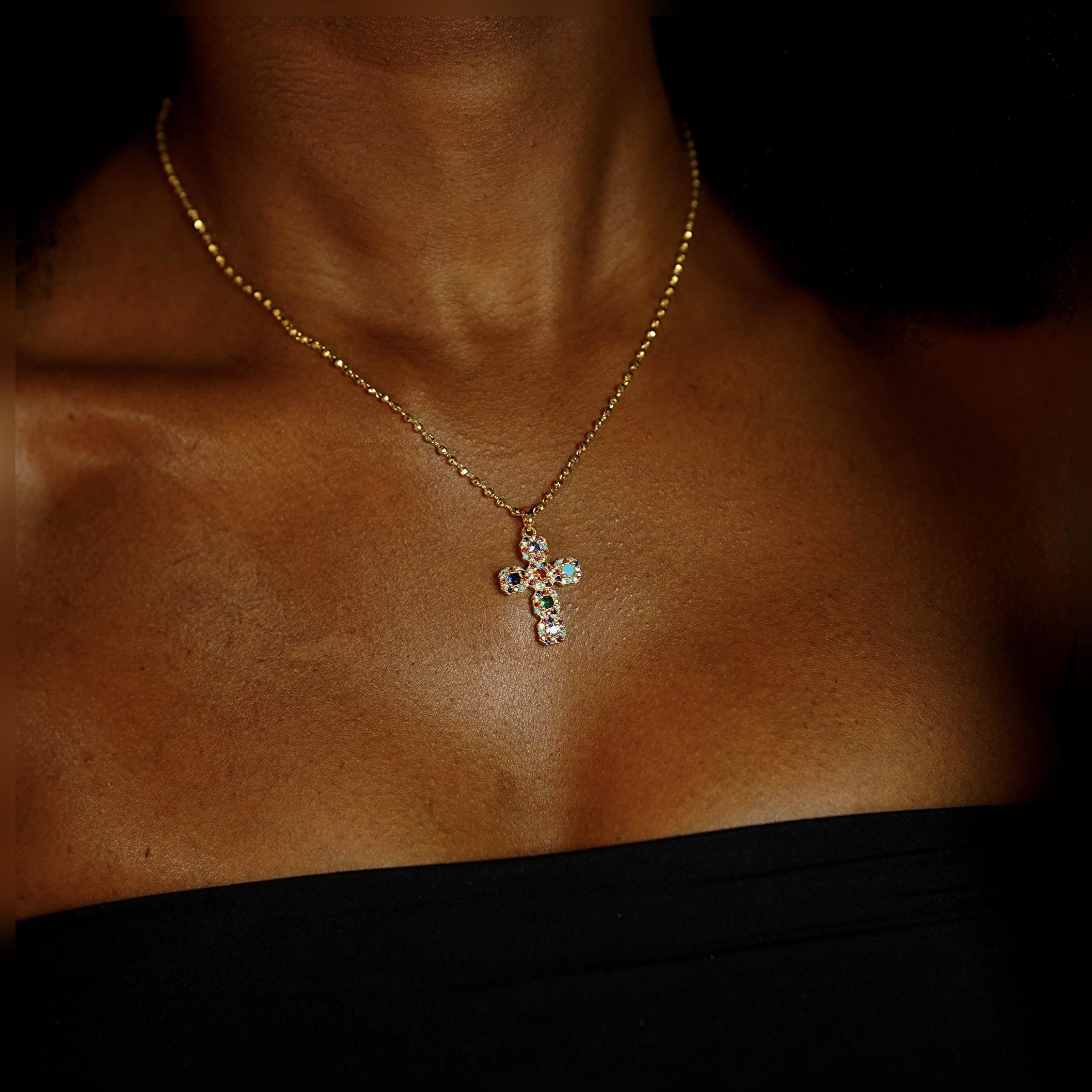 A twist on our popular Icy cross, this necklace features a unique multicolor pendant in two different size options. It showcases a plethora of stone and cz types, colors and sizes. The design is both eye-catching and versatile, perfect for layering and wearing on any occasion.