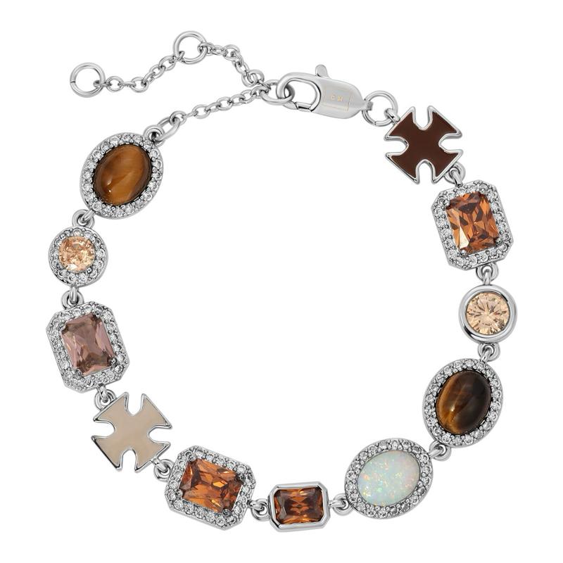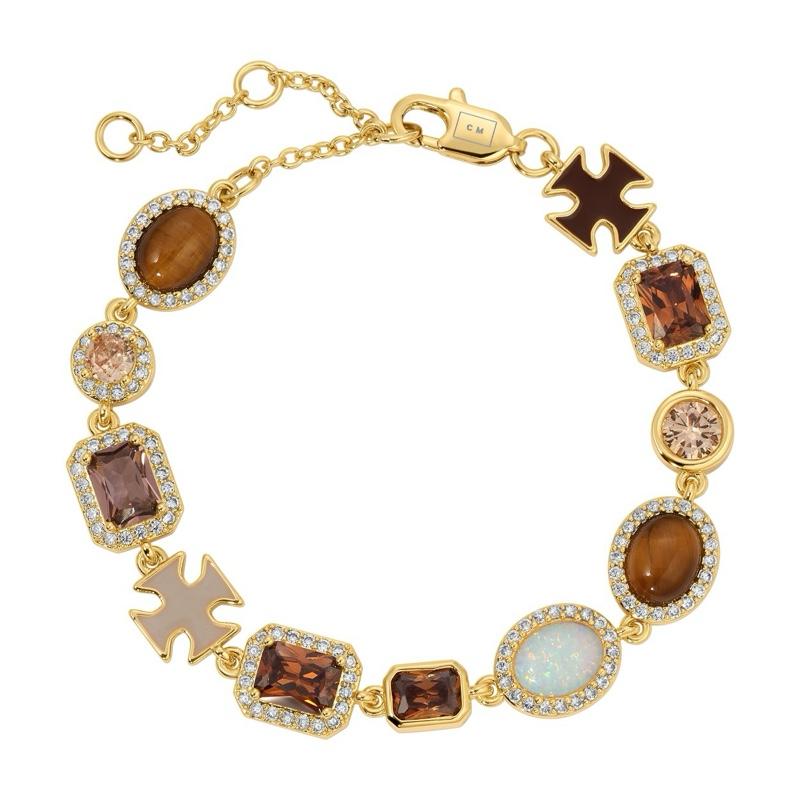 The Mocha Solstice Necklace features a stunning array of Brown CZs, Tiger’s Eye, and White Opal. The necklace is crafted in gold and white gold over brass, offering a luxurious look. The adjustable length allows for a perfect fit, extending by +2 inches. The bracelet is adjustable by + 2.5 inches.