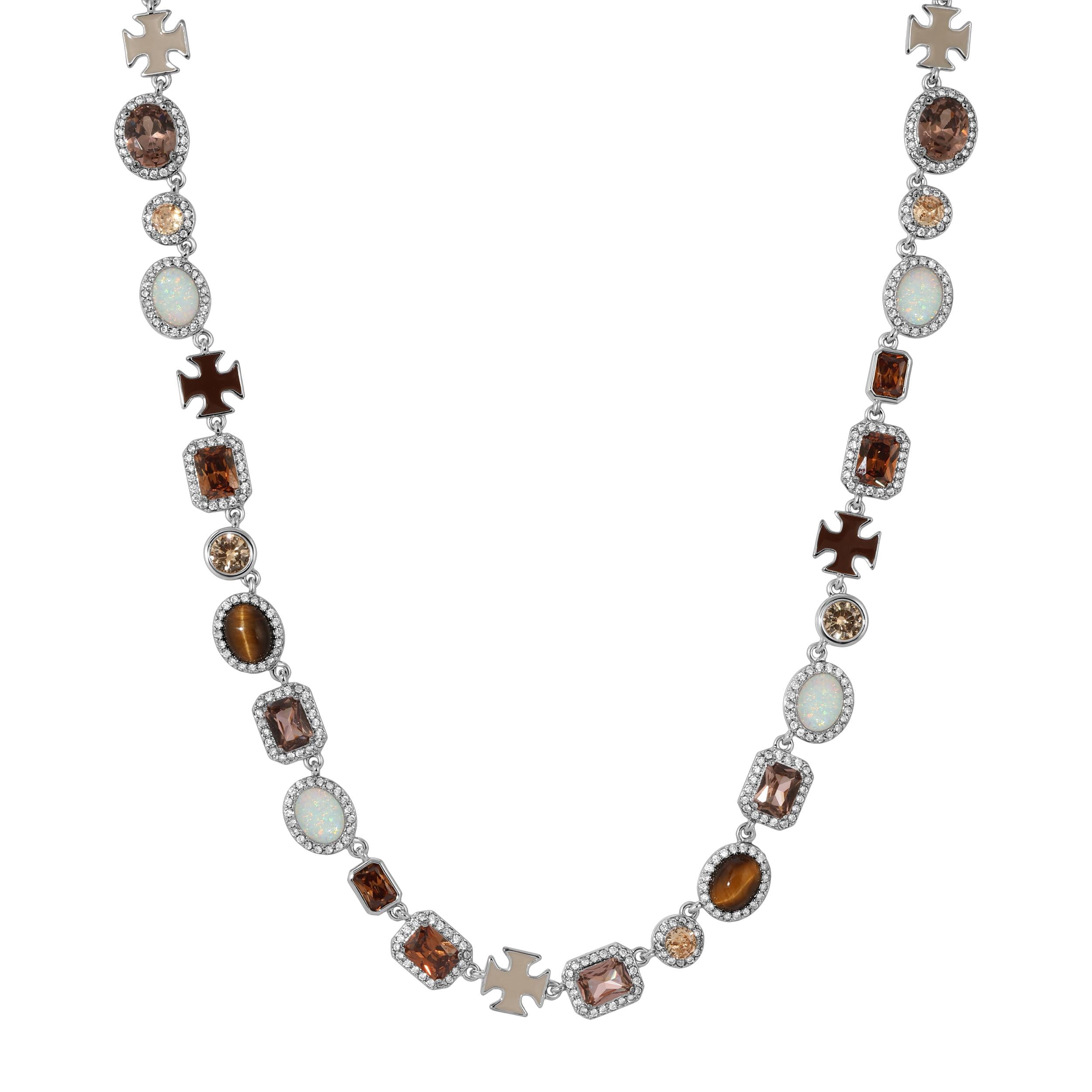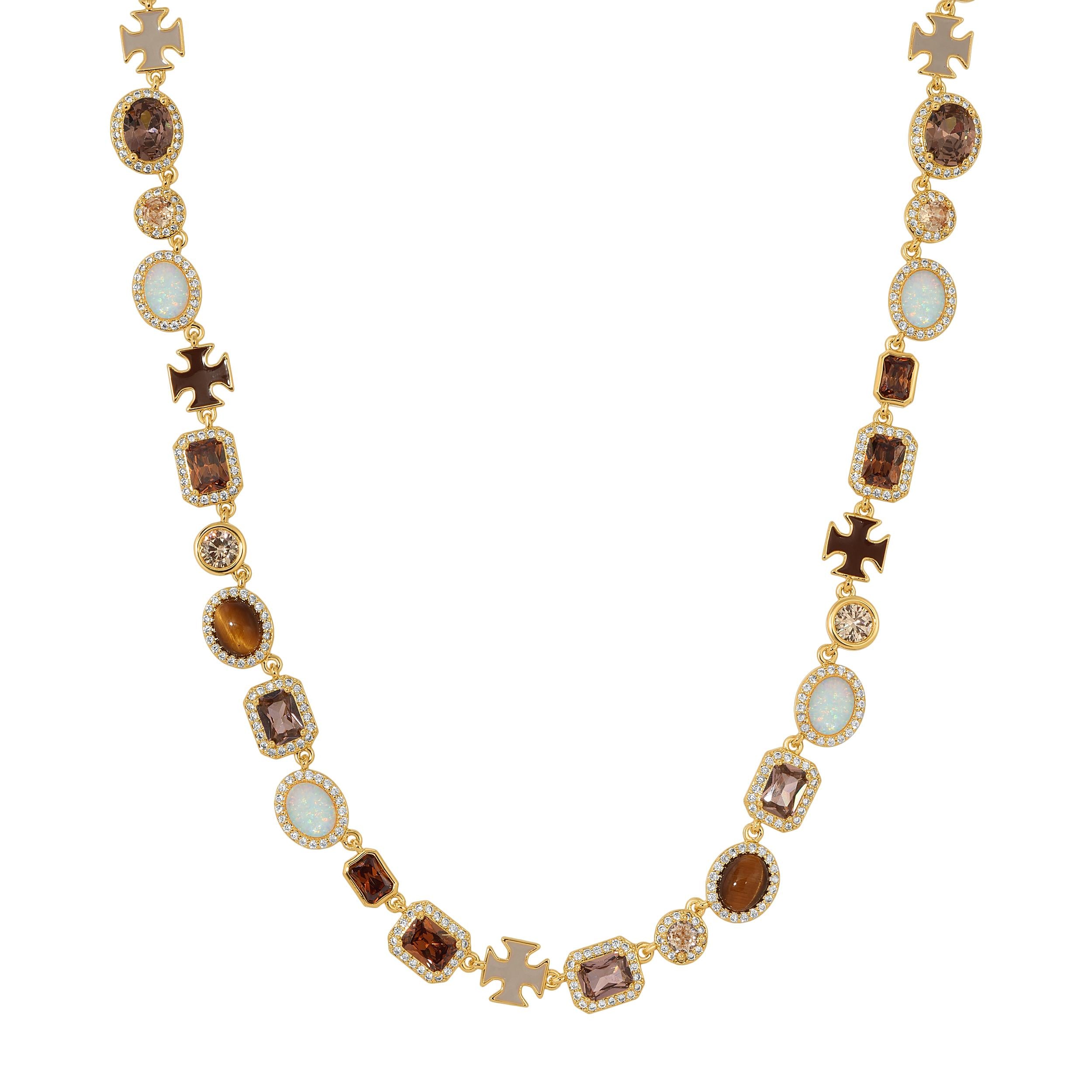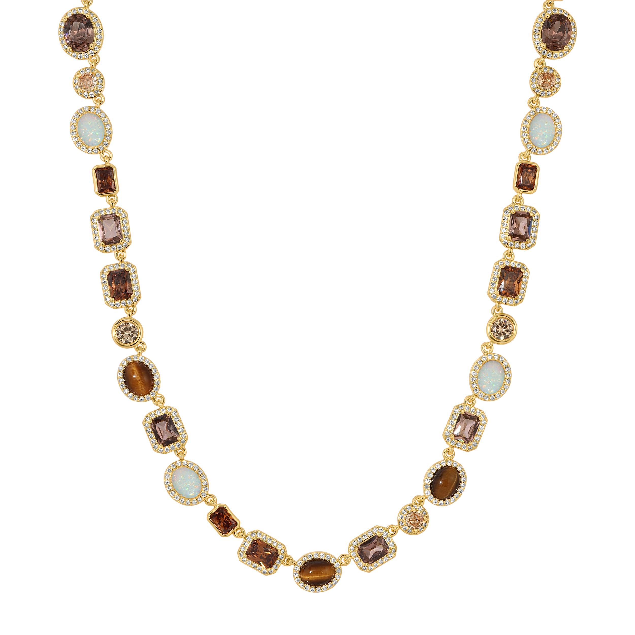 The Mocha Solstice Necklace features a stunning array of Brown CZs, Tiger’s Eye, and White Opal. The necklace is crafted in gold and white gold over brass, offering a luxurious look. The adjustable length allows for a perfect fit, extending by +2 inches.
