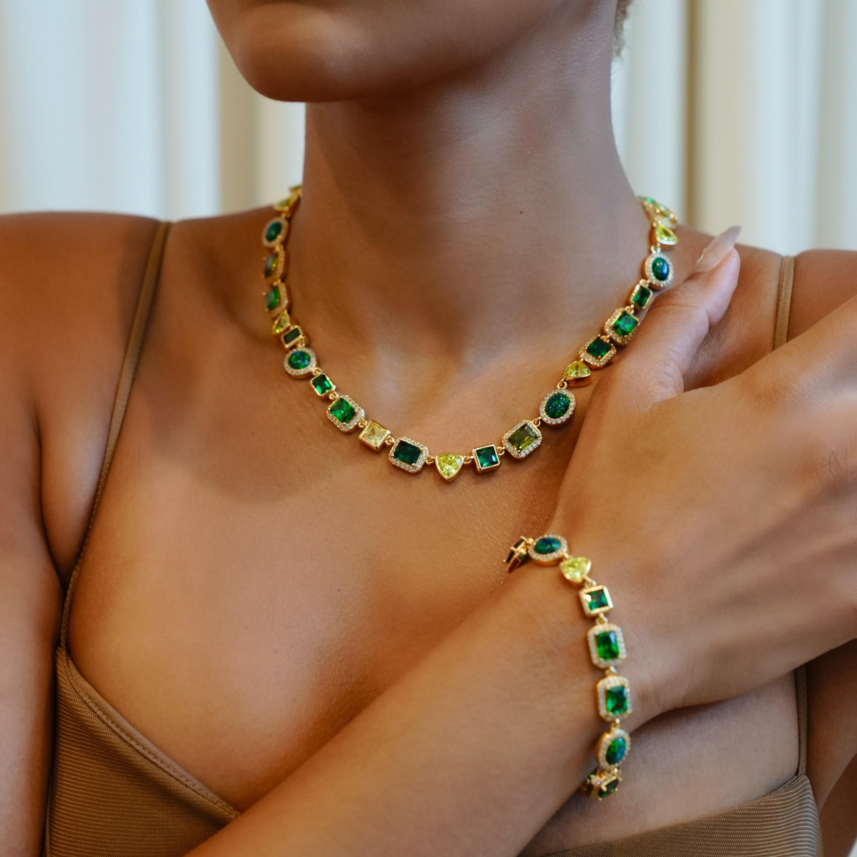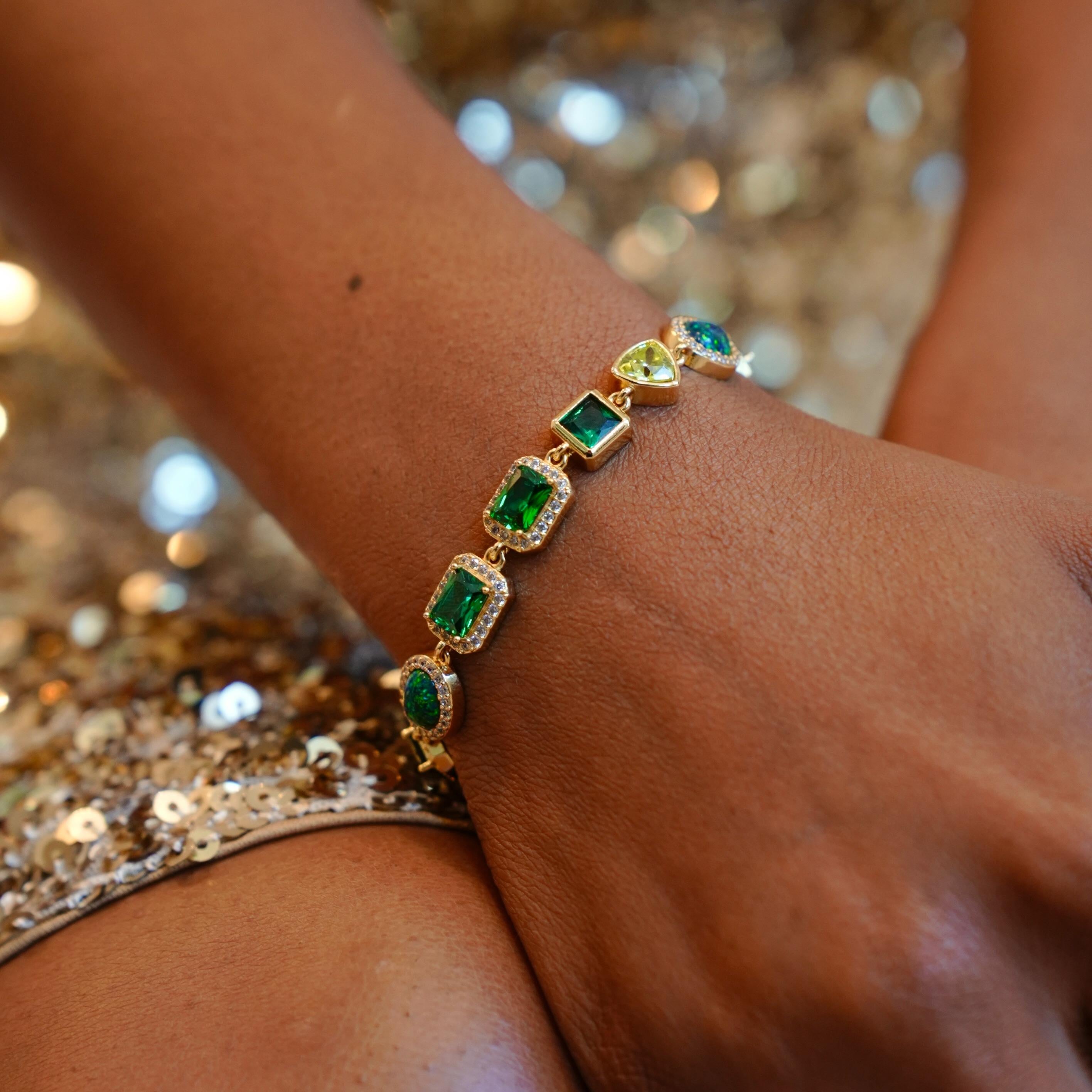 The newest addition to our Solstice Gemstone collection, this bracelet epitomizes luxury and sophistication. It features our new rounded triangle shape and green-toned gemstones and opals, meticulously placed to highlight their natural brilliance. Perfect for individual wear or layering, it's a great statement piece. The bracelet is unisex and adjustable between 7-9 inches. Matching necklace and anklet sold separately.